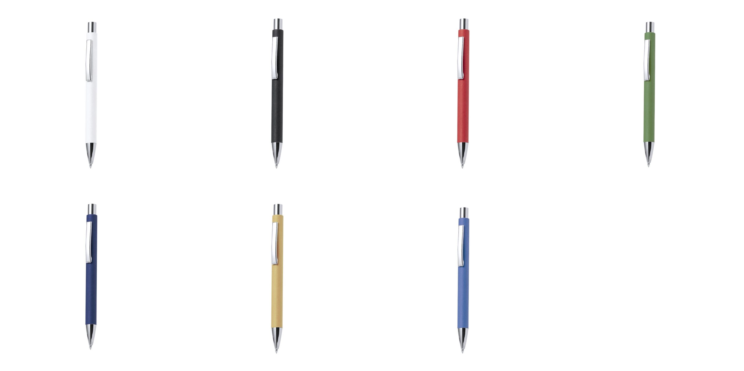 Eleganten kemični svinčnik s pritiskom na gumb, ohišjem iz recikliranega papirja in sijočimi srebrnimi kovinskimi deli. Modro črnilo in široka paleta barv.